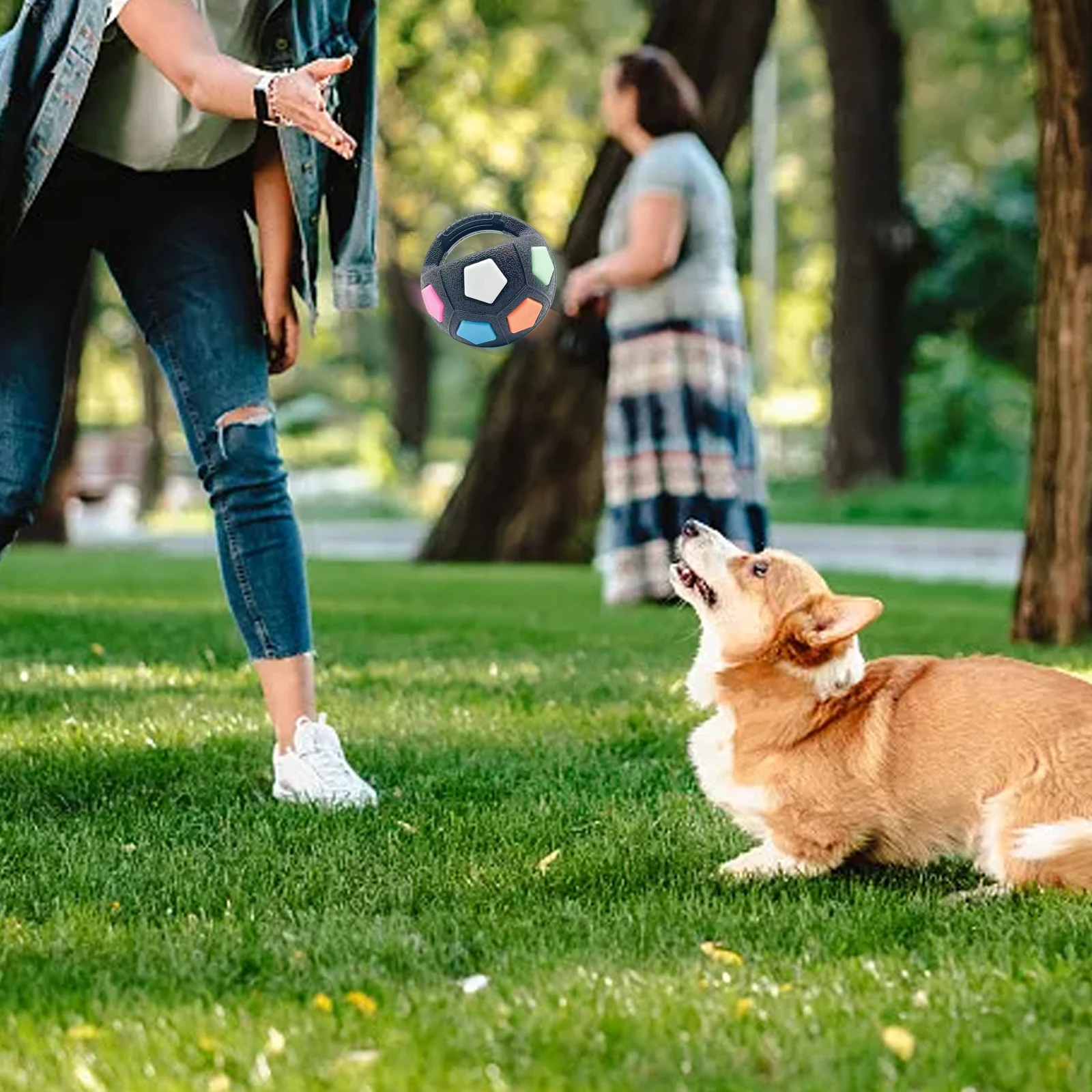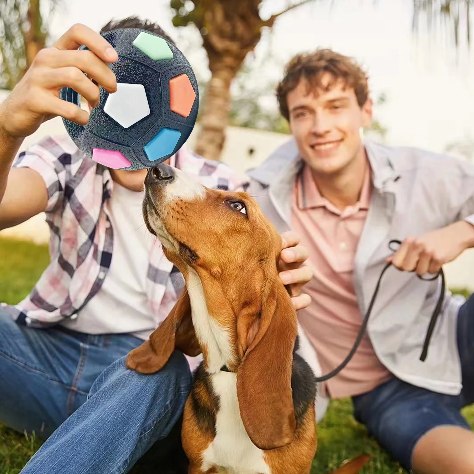 Features: 1.Dog Calming Ball with Convenient Handle: Designed for effortless toss and fetch sessions, this dog calming ball features a handy grip and vibrant patterns. The internal squeaker ignites natural instincts and keeps your pup engaged during interactive play. 2.Sturdy Rubber Construction: Engineered for tough chewers, our dog football toy is crafted from premium rubber that withstands intense gnawing. This ensures long-lasting use, making it an exceptional choice for energetic and active dogs. 3.Engaging Squeaky Fun: When bitten or rolled, the interactive football shape dogs toy emits a distinct squeak, capturing your dog's attention. The sound stimulates curiosity, providing hours of engaging playtime and mental enrichment. 4.Optimal Size for Medium & Large Breeds: The interactive squeaky pet football offers a ideal size for medium to large dogs. Its easily graspable handle allows for comfortable throwing and retrieving for both pet owners and their furry friends. 5.Training & Entertainment Combo: Use the pet dog football shape toy as a basic training tool to boost obedience and athletic skills. It encourages healthy activity, strengthens muscles, and improves your dog's agility and responsiveness. Specification: Material: plastic Note: ![]() 1 x Dog Calming Ball